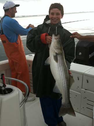 The morning trip was cut short by the storms that moved through. Jordan Wergiles landed a solid 18lb striper and a much larger fish has hooked and lost during the fight. The group missed the best part of the bite while waiting at the dock for the storms to pass.