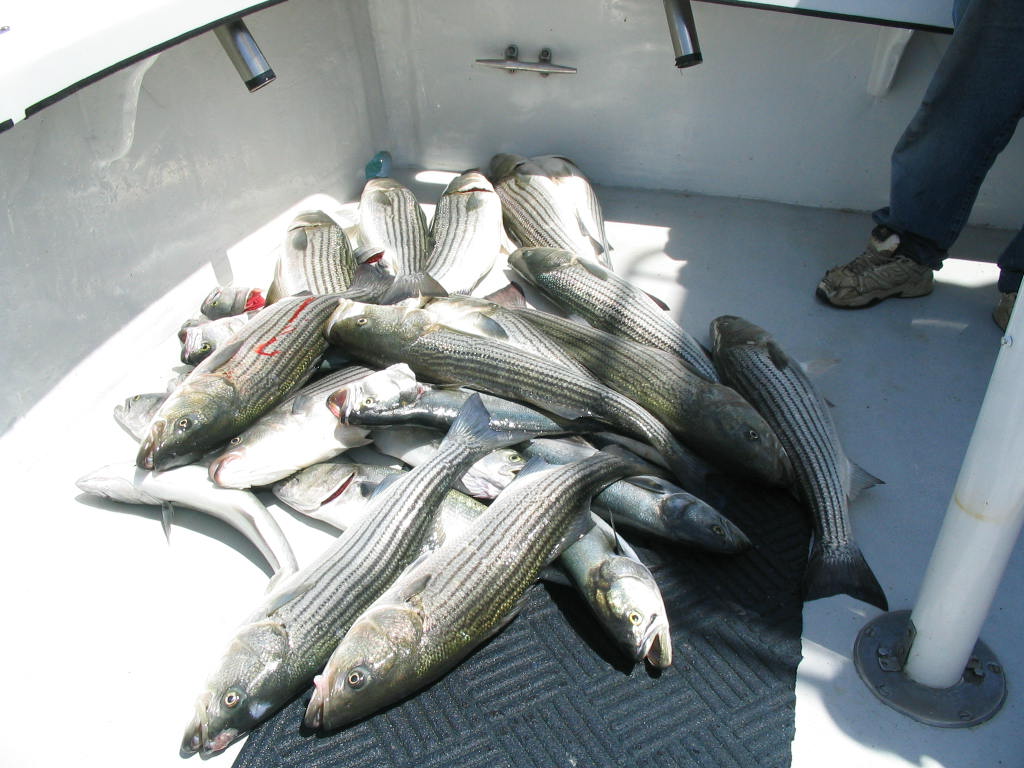Bluefish showed up pretty good at the North End of Block Island along with the Striped Bass on Thursday June 2nd, just before the change of tide and the wind started howling up to 35 kts. out of the NW. Had the Mike Benoit crew with me trolling for bass and blues and they caught their limit of bass up to 22 lbs. and 13 bluefish that “Rock” was going to put into the smoker. All fish were trolled up with umbrella frames with tubes and shads. The fish were all stuffed with sand eels, and spitting them out all over the deck.