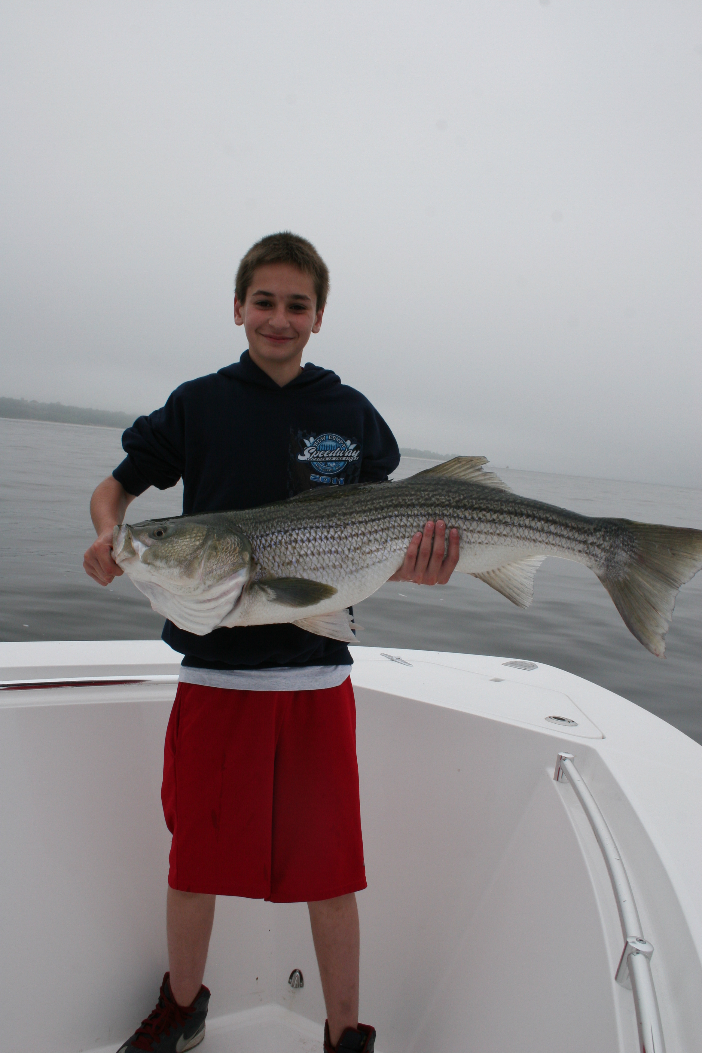 Had a good trip in some dense fog and some lively bunker and pictured below is Anthony “The King” of Garbage fish and his nice 28lb Bass that inhaled a live one.