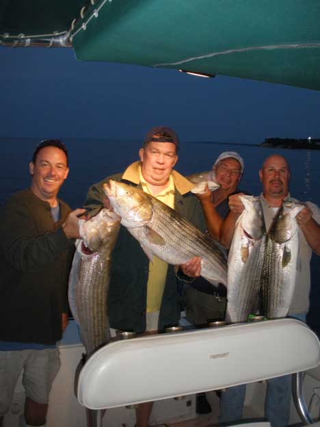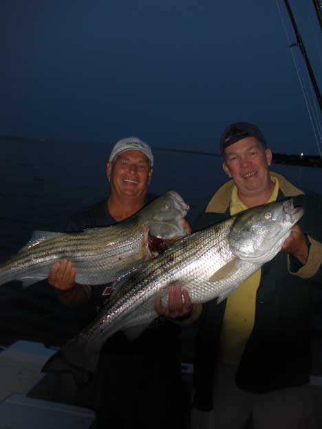 After work, friends, Mike, Kenny, Steve, Ed and Capt. Skip went out to see if the jig bite was on, and YES it was!. The Boys had their limit of Bass to 23 lbs. Steve was high hook with the 23 lb. Bass caught on light tackle. Other big fish were caught by Kenny, but it managed to get away close to the boat. All fish were in the 13-23 lb. range.