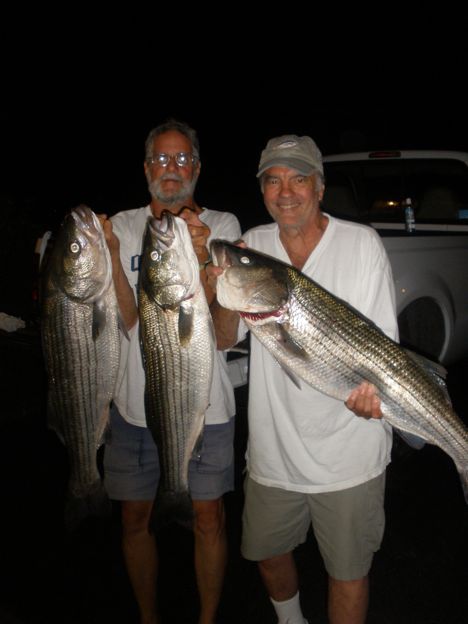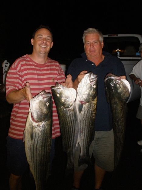 This Evening , Capt. Skip had to do some power steering repairs, and when the job was a quick success, Kenny, Ron, Ravioli Ron, and Mike jumped aboard for a non-stop slamming bite of Bass to 22 lbs. Mike and Kenny both had 20 + lb. fish, while the others weren’t far behind. In all, everyone limited out and also threw back 2 dozen Bass. What a awesome evening. The bite is back in full swing!