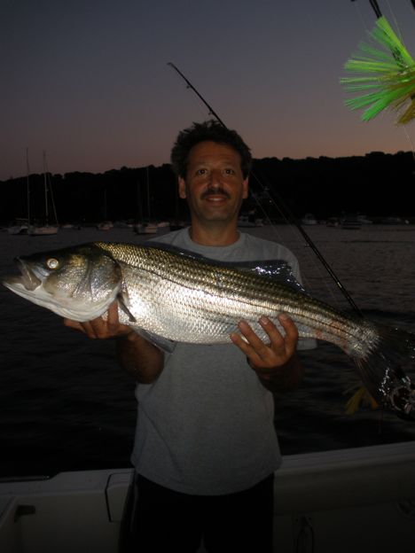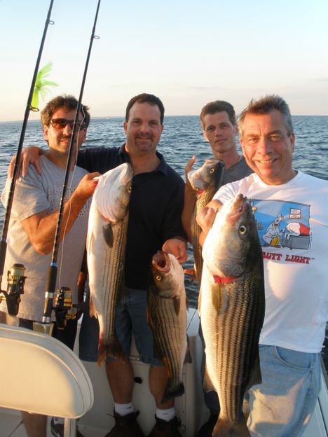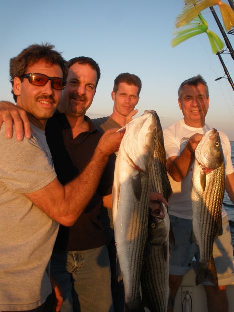 This evenings trip with Sal, Mike, Mike, and Danny saw a solid bite of Striped Bass on the outgoing tide! All men had Bass in the 29″ -33″ range. The crew also boated some big chopper Blues! When the tide went slack the bite slowed, but all had some real good action for over 2 hours! Lots of food, drinks and fun was had by all! Thanks guys!