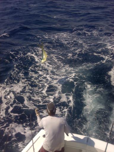 The past couple of days here in Fort Lauderdale FL the winds have been out of the north east at 15-20 mph, seas running 5-6 ft. with occasional 8 footers, making it quite sporty. These northeast winds blew the blue waters closer into the reef accompanied by sargassum weed. These conditions have allowed us to have the best Mahi Mahi fishing all year long. Mahi Mahi’s have been running from 5-25 lbs. mixed in with an occasional Wahoo, if you are fortunate enough to find boards floating in the weed lines.