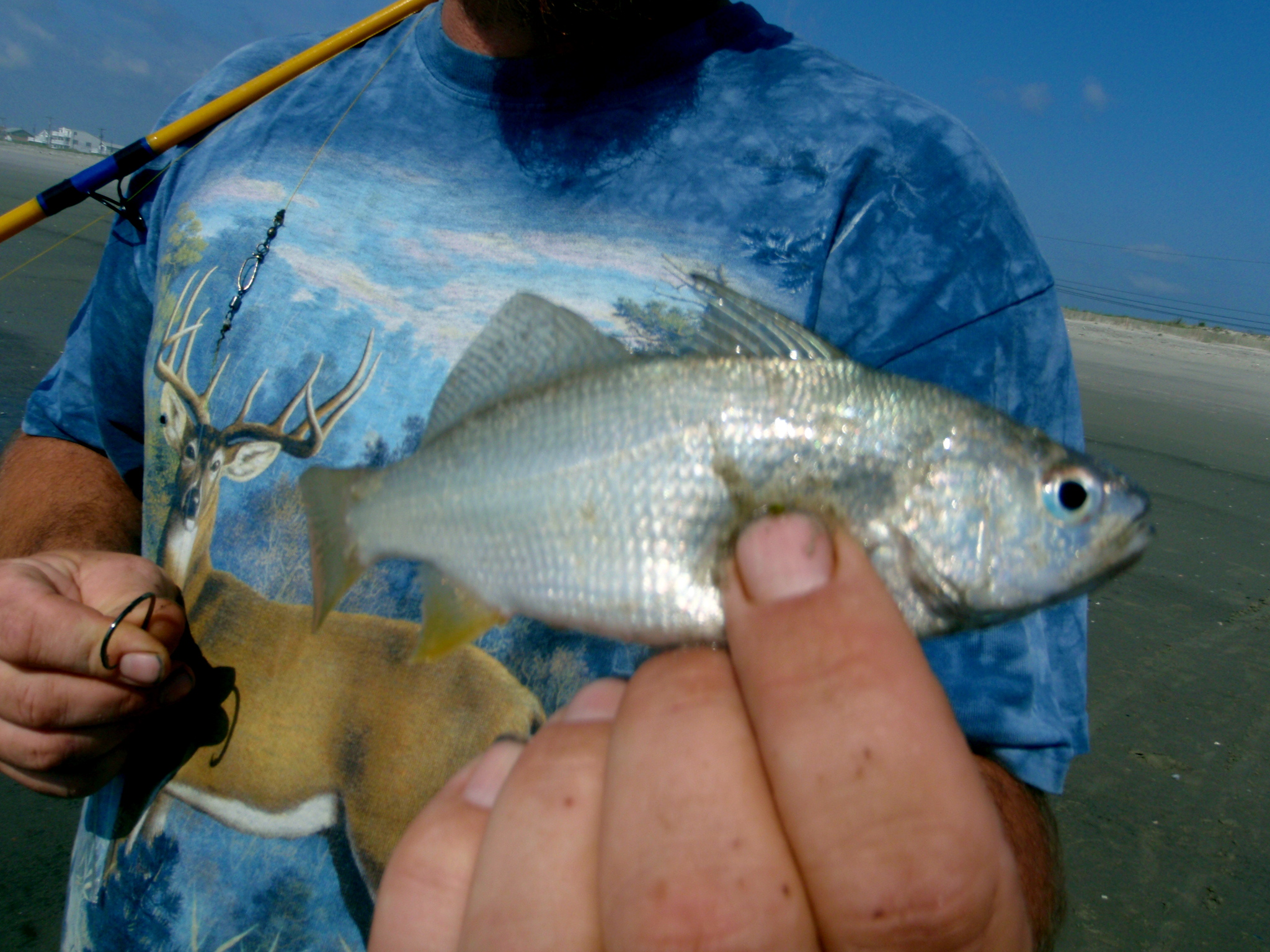 Hit the beach early this morning with John and Rich. We caught the last of the outgoing tide and turn. Perfect weather; warm, slight breeze, and enough cloud cover to keep the sun manageable. The water was comfortably warm too (I forgot my waders). We set out 4 rods with Clams, and one rod with my killer Kingfish rig and Bloodworm. The Kingfish rig struck first with a really nice big Kingfish. A bit later I got another Kingie. We switched all but one rod over to the Kingfish rigs and Bloodworms. The Clams never got a touch. Go figure, the past few weeks you couldn’t put a Clam in the water without hanging a Striper. Anyway, we managed just one more Kingfish and a Silver Perch, and 30 or so tiny, baby Doggies. The big mommys of the past few weeks left us hungry little gifts. We tried the Perch and a Kingie head as bait, but no takers. The best action was on the falling tide. Once the tide started in, the Doggies were all over the Bloodworms. We called it a day around 11Am in hopes of beaqting the Shoobie traffic. Yea, that didn’t happen…