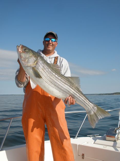 THE BITE STARTED A BIT SLOW, BUT AS THE TIDE SLOWED, THE BITE PICKED UP….THE CREW LIMITED OUT IN NO TIME WITH NICE 10 – 15 LB. BASS…THEN CAPT SKIP GOT A NICE HIT…THE FISH FELT LIKE A BIG FISH ( 30 LB. CLASS OR BETTER)…ONLY TO BE DISAPPOINTED THAT THE 36″ FISH WAS FOWL HOOKED!