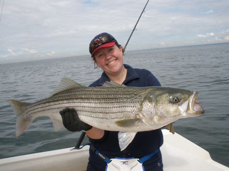 The gang had fish after fish trolling and jigging light tackle…There were a few bluefish mixed in with the Bass..but that didn’t affect the Bass bite. Stephanie was high hook with a nice 27 Lb. trophy Bass. All others caught Bass from 10- 20 lbs.