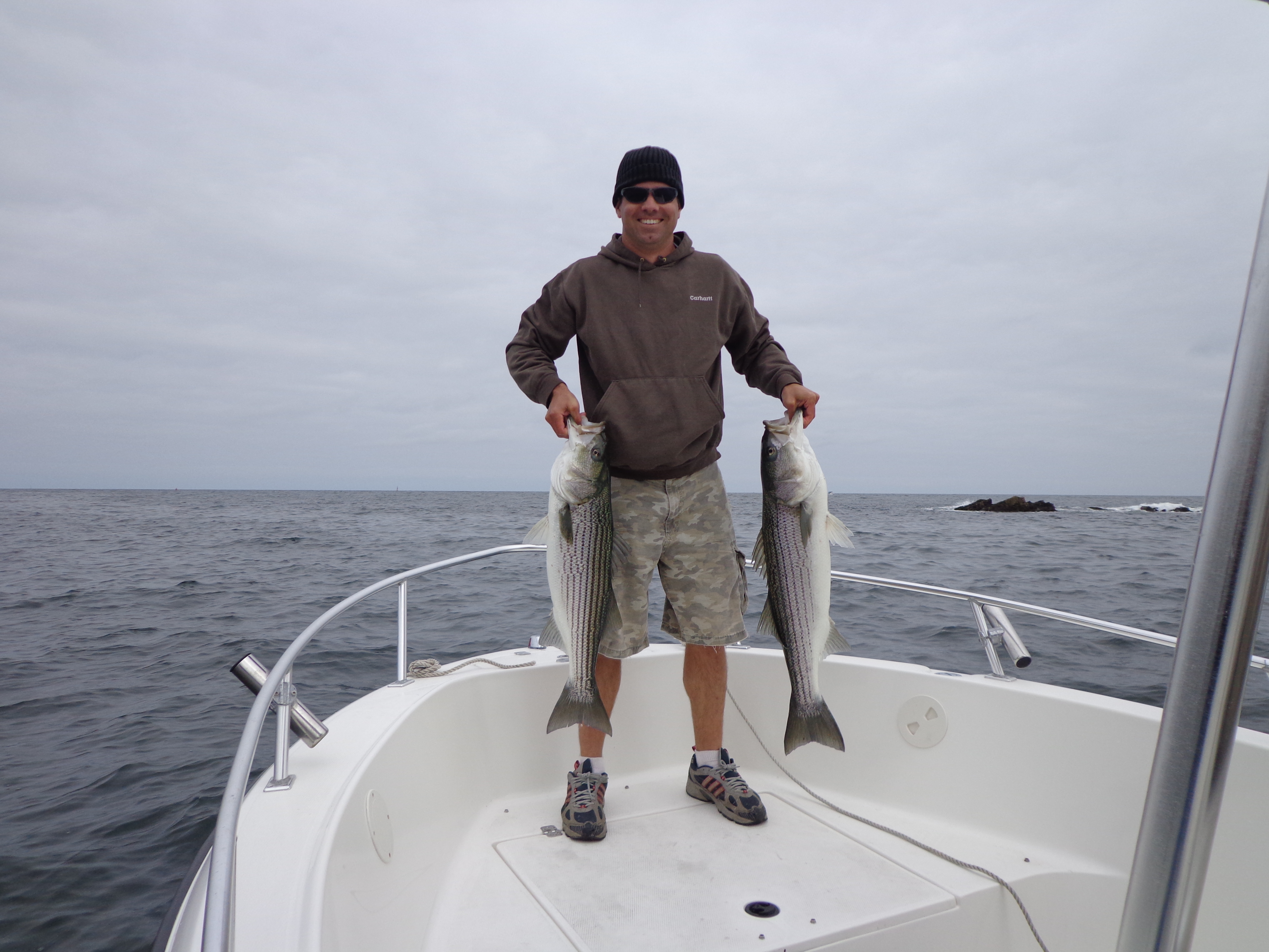 The Striper fishing is excellent right now. We are catching good numbers of fish every day, from slot limit size to up to fish well over 40 inches. Mackerel, pollock and herring are plentiful and fairly easy to catch right now. We saw our first blue shark of the year a few days ago, and the Tuna have been showing up here and there. No consistent bite yet from the Tuna, but they are available. Water temps have been between 56-62 depending on the wind direction, and the water is starting to clear back up from all that rain we had last week. Looking forward to fishing the heat wave this week.