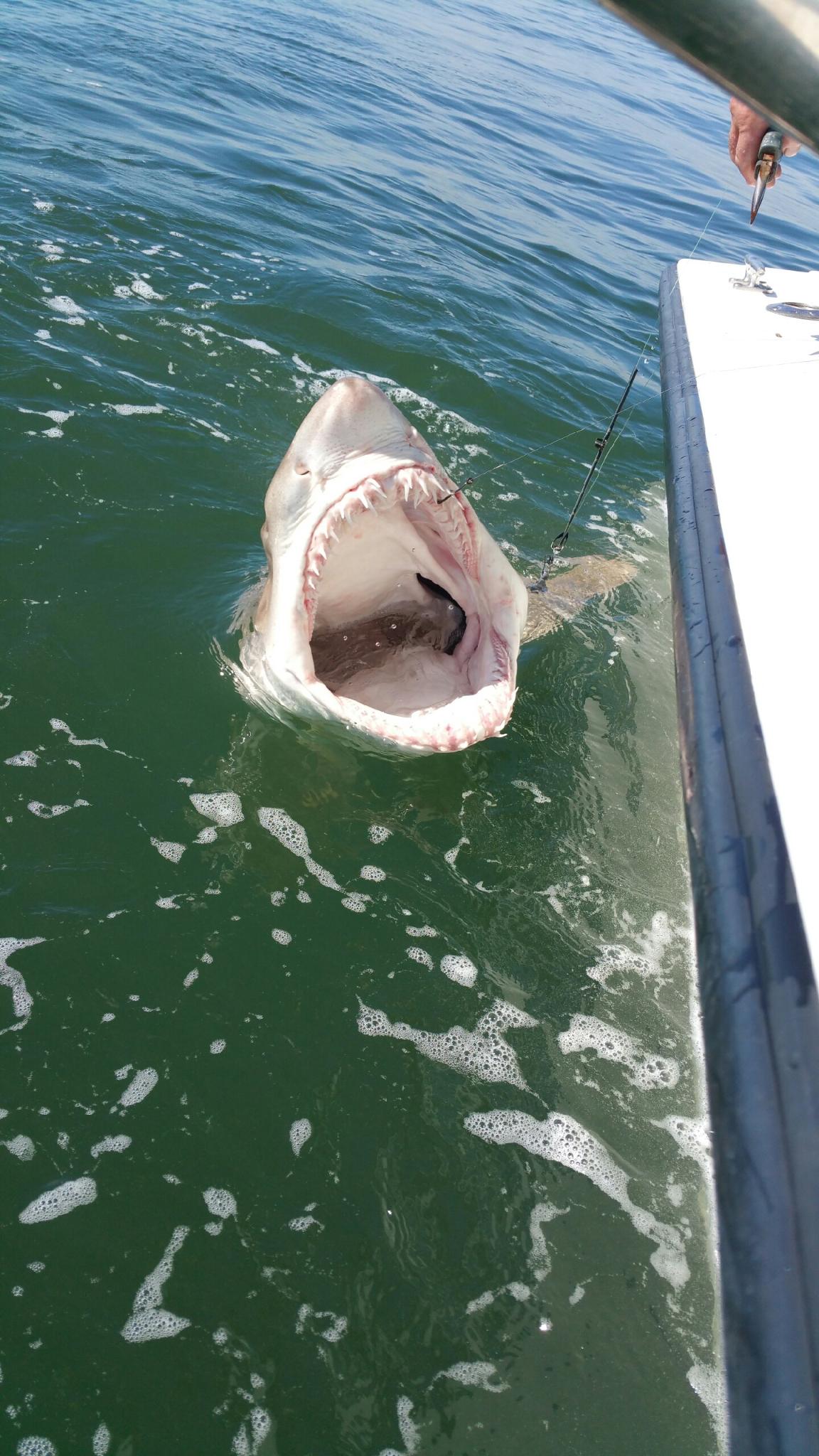 Our charter guests Thursday hooked Bluefish, Red Drum (Redfish), and surprised all aboard by bringing two 10+ foot Sand Tiger Sharks to the boat!